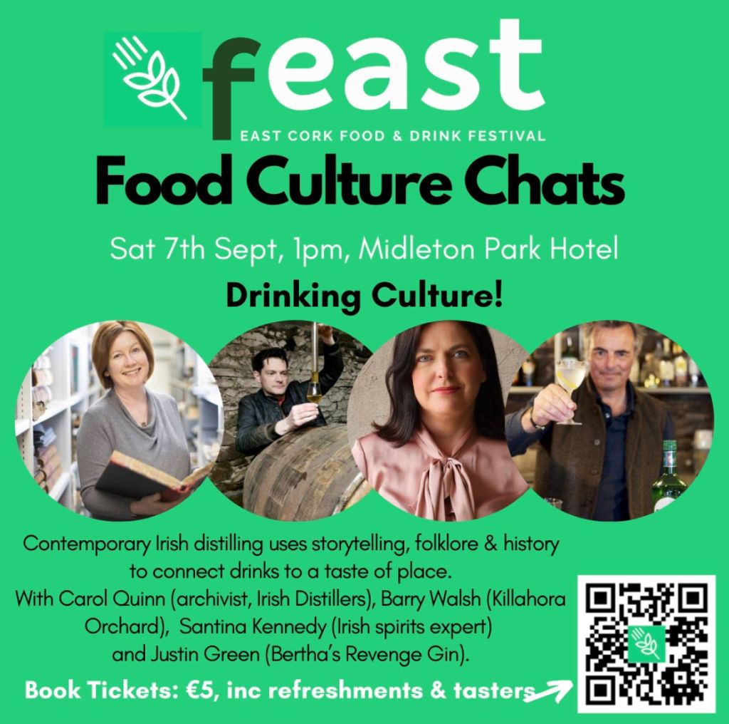 Food writer, Kate Ryan, will be hosting “Food Culture Chats” at Feast Food Festival. Kate has curated three brilliant panels for this year’s festival. Taking place on Saturday the 7th of September from 11:30am at the Midleton Park Hotel. Tickets cost just €5. The drinks panel begins at 1:00pm, covering the topic of “Drinking Culture”. Hear how stories, folklore and history are changing the way we engage with iconic Irish spirits. Nothing “loosens the larynx” like a wee dram of something, so pull up a chair and tune into some great yarns. The panel features Carol Quinn of Irish Distillers, Barry Walsh of Killahora Orchards, Justin Green of Ballyvolane House/Bertha’s Revenge, and independent Irish drinks consultant, Santina Kennedy.
